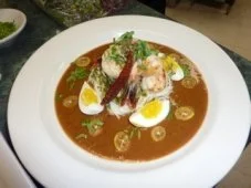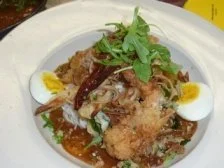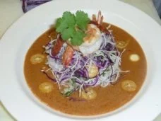 I have returned from my trip refreshed and ready to get back in the kitchen. Before I went to Thailand I was experimenting with some new dishes. The first is a deconstructed spin on a classic Thai-Muslim dish called Kanum Jean Num Prig. I'm not sure if I've mentioned it before its been on the drawing board for eight weeks now. It is a Tamarind curry with half a kiffer lime simmered in the sauce served over rice noodles, fresh vegetables and tempura greens.
